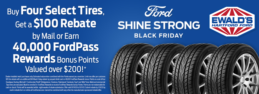 Are you in need of a new set of tires or some top-notch Ford service to keep your vehicle in great shape? Now is the perfect time of year to get the tires and service that your vehicle deserves! With the Ford Service Black Friday Sales Event going on now at Ewald’s Hartford Ford – drivers can enjoy enhanced rebates from 11/11/22 – 12/3/22. You’ll have your choice of a $100 rebate by mail OR 40,000 FordPass/Lincoln Access Rewards Points when you purchase a set of four (4) tires from one of the following eligible tire brands: